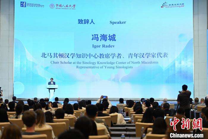 ▲北马其顿汉学知识中心教席学者、青年汉学家代表冯海城在开幕式上发言。中新社记者 陈楚红 摄