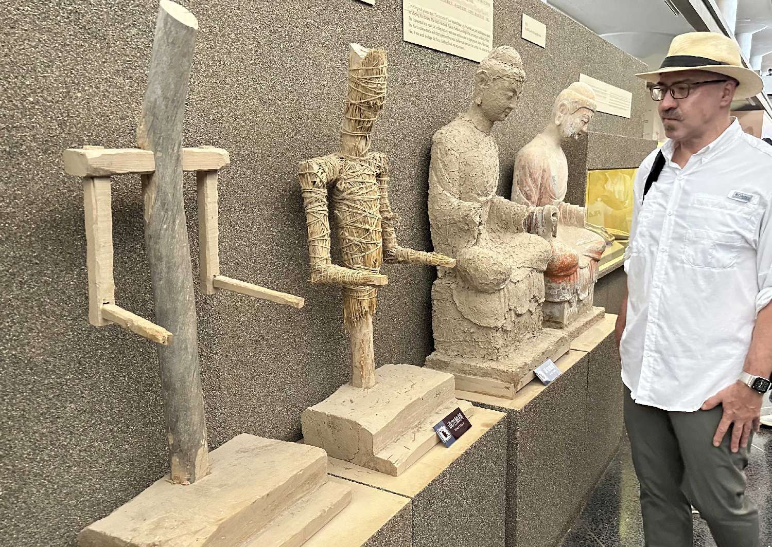 ▲2025年8月8日,史瀚文在敦煌石窟文物保护研究陈列中心研究彩塑的制作过程。中新社记者 冯志军 摄