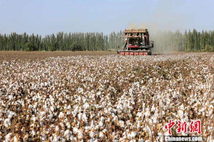 ▲2025年9月28日,新疆阿克苏地区一种植基地种植的长绒棉进入采收季,采棉机在田地里采收并打包。中新社记者张宇 摄