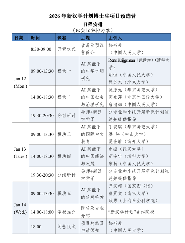 为了帮助具有一定学术潜力且有志于从事汉学及中国研究的外籍青年学者更加深入了解新时代汉学和中国研究领域的现状与未来规划,中国人民大学“新汉学计划”专家委员会秘书处将承办2026年“新汉学计划”博士生预选营,通过邀请领域内著名专家讲座等形式,介绍学科前沿信息,提供学术研究建议、博士申请介绍、学术生涯指引和学术写作指导等帮助,帮助青年学者进一步提高科研能力。