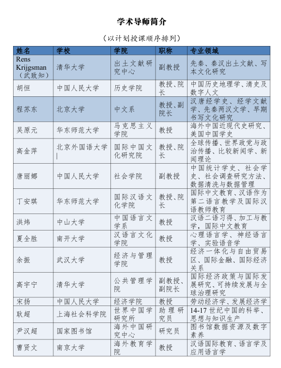 5.写作指导:将提供两次分组研讨课,邀请导师和新汉学学者介绍研究计划写作经验。此外,在课程结束后两周内提交项目申请书的参与者,可获得学业导师的评阅和指导意见。