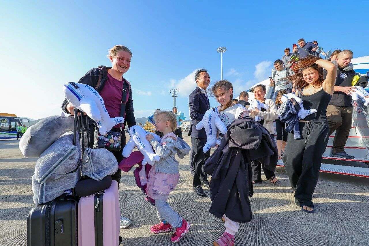 ▲2025年12月22日,来自捷克的游客乘坐DV482航班抵达海南三亚。(图片来自中新社骆云飞摄)