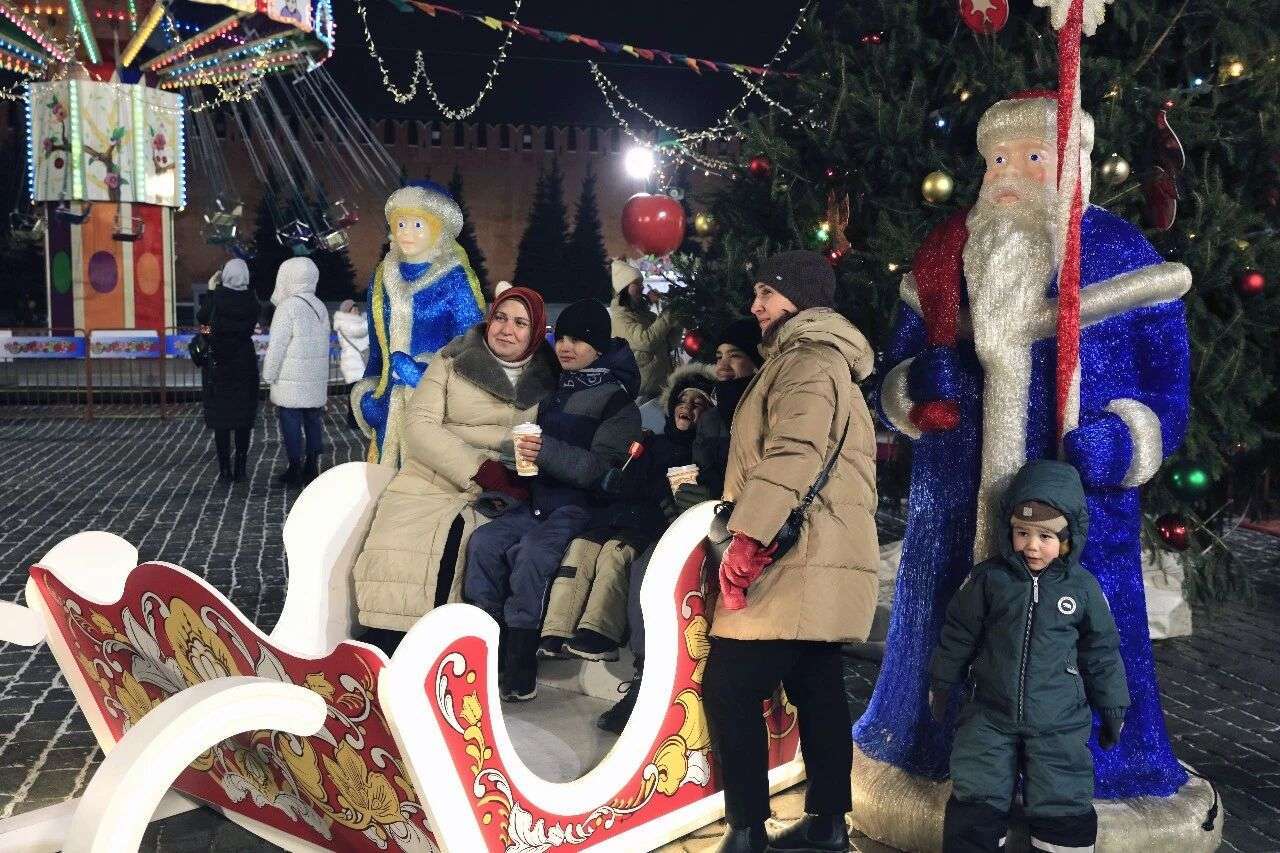 ▲当地时间2024年12月6日,俄罗斯首都莫斯科,游客在红场新年集市上的雪橇车合影。随着新年将至,莫斯科多个新年集市拉开帷幕。(图片来自中新社 田冰 摄)