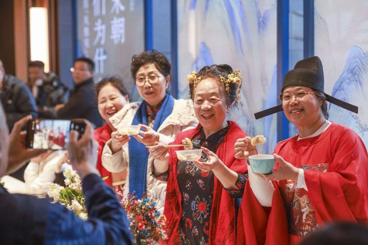 ▲2025年12月21日,居民穿上中国传统服装吃饺子。当日正值冬至节气,北京市朝阳区中建宸园小区内举行“画九待春归,冬至大如年”主题冬至民俗活动。(图片来自中新社 贾天勇 摄)