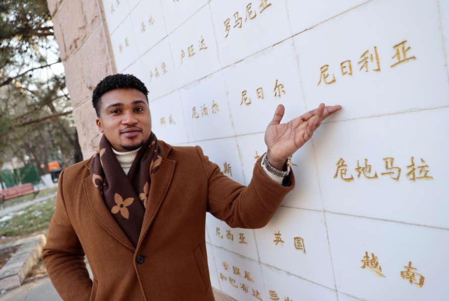 ▲1月22日,尼日利亚青年汉学家李明诚在北京语言大学文化墙留影。李国庆摄
