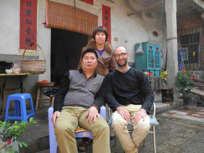 ▲2014年,范狄(右)在福建漳浦的六鳌渔村和当地家庭合影。(图片来自受访者)