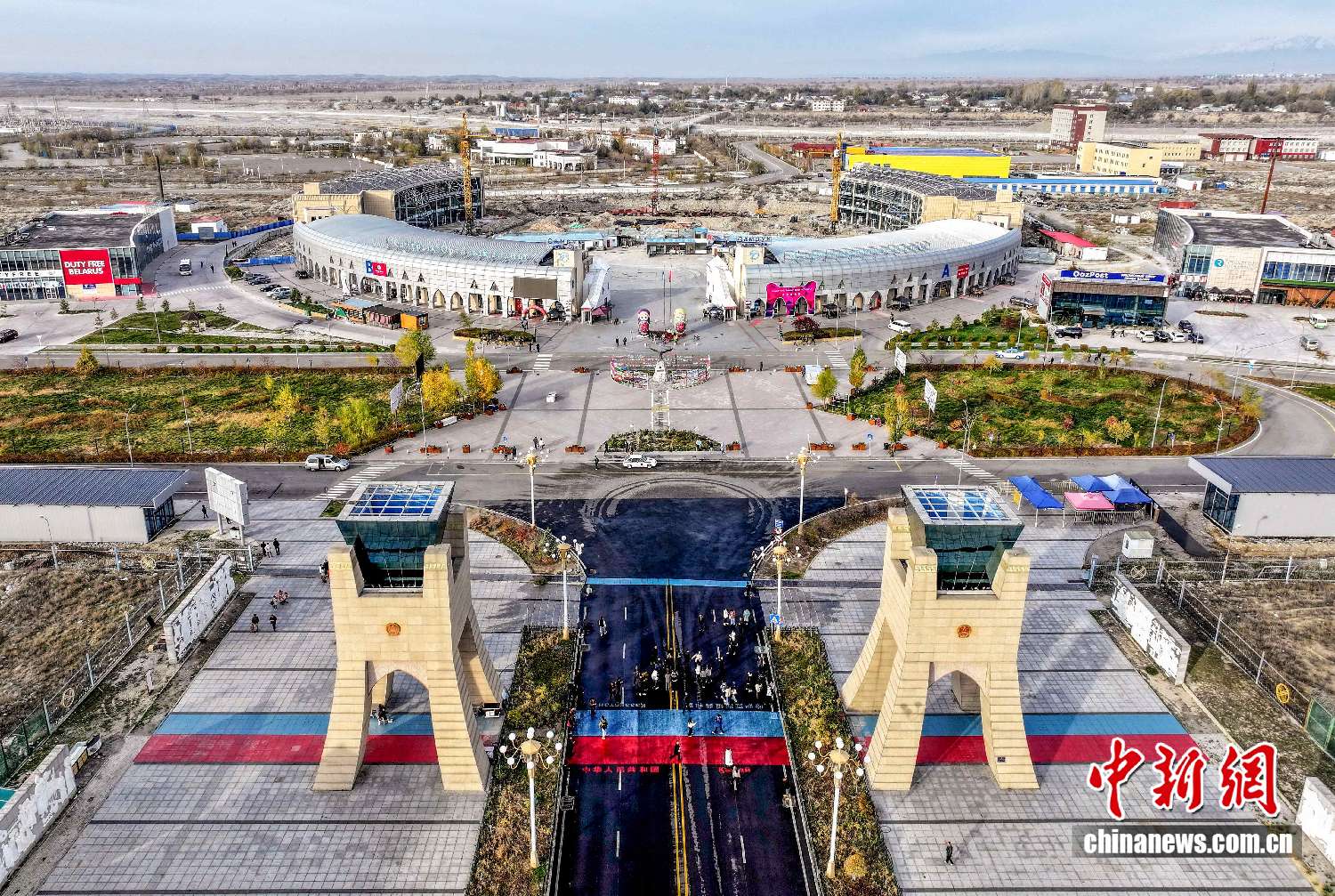 ▲俯瞰中哈霍尔果斯国际边境合作中心两国连接通道及哈方区域的金雕广场。(图片来自中新社)