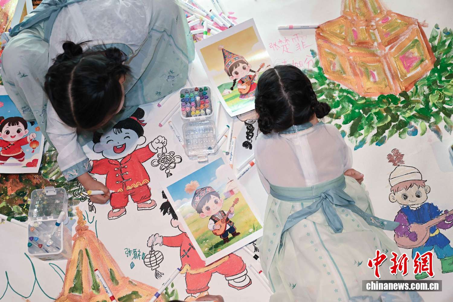 ▲2026年3月14日,“春天的约定:中哈青少年共绘友谊”文化交流活动在北京举行。图为小朋友为画卷上色。(图片来自中新社)